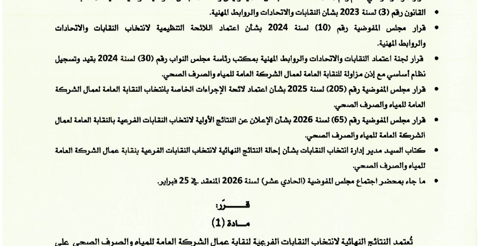 قرار مجلس المفوضية رقم (79) لسنة 2026 بشأن اعتماد النتائج النهائية لانتخاب النقابات الفرعية لنقابة عمال الشركة العامة للمياه والصرف الصحيقرار مجلس المفوضية رقم (79) لسنة 2026 بشأن اعتماد النتائج النهائية لانتخاب النقابات الفرعية لنقابة عمال الشركة العامة للمياه والصرف الصحيمتابعات: من فعاليات اليوم الأول للورشة التدريبية لسفيرات التوعية الانتخابية في طرابلس وسبهامتابعات: من فعاليات اليوم الأول للورشة التدريبية لسفيرات التوعية الانتخابية في طرابلس وسبهاإعلان: فتح باب الترشح لانتخاب النقابة العامة ( نظام القائمة ) لنقابة الصيادينإعلان: فتح باب الترشح لانتخاب النقابة العامة ( نظام القائمة ) لنقابة الصيادينالذكرى 74 لاستقلال ليبياالذكرى 74 لاستقلال ليبياإعـلان: عن البدء في عملية انتخاب النقابات الفرعية بنقابة الصناعات الغذائيةإعـلان: عن البدء في عملية انتخاب النقابات الفرعية بنقابة الصناعات الغذائية الأنتخابات 2025 رجال الناخبين نساء مواقــــع تهمــك برنامج الأمم المتحدة الإنمائي المؤسسة الدولية للنظم الانتخابية الأمم المتحدة المعهد الديمقراطي الوطني المعهد الدولي للديمقراطية ومساعدات الانتخابات